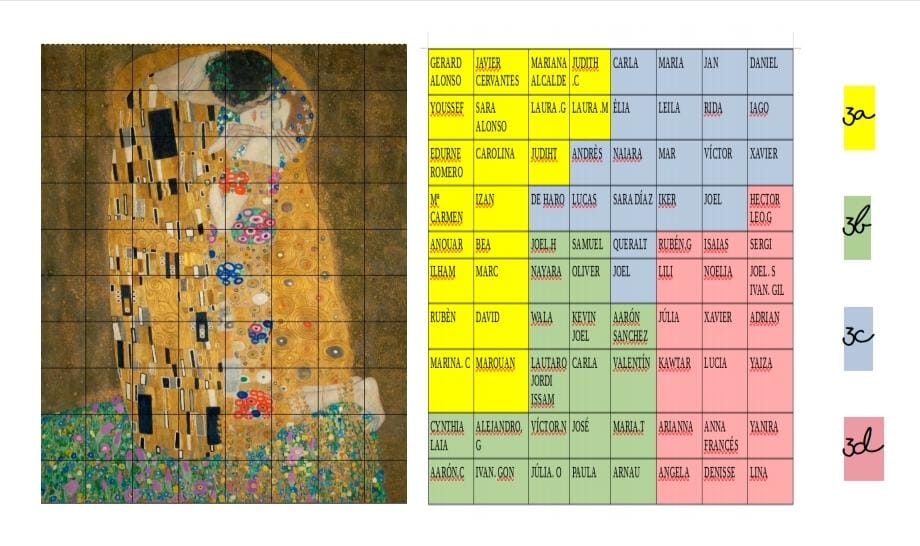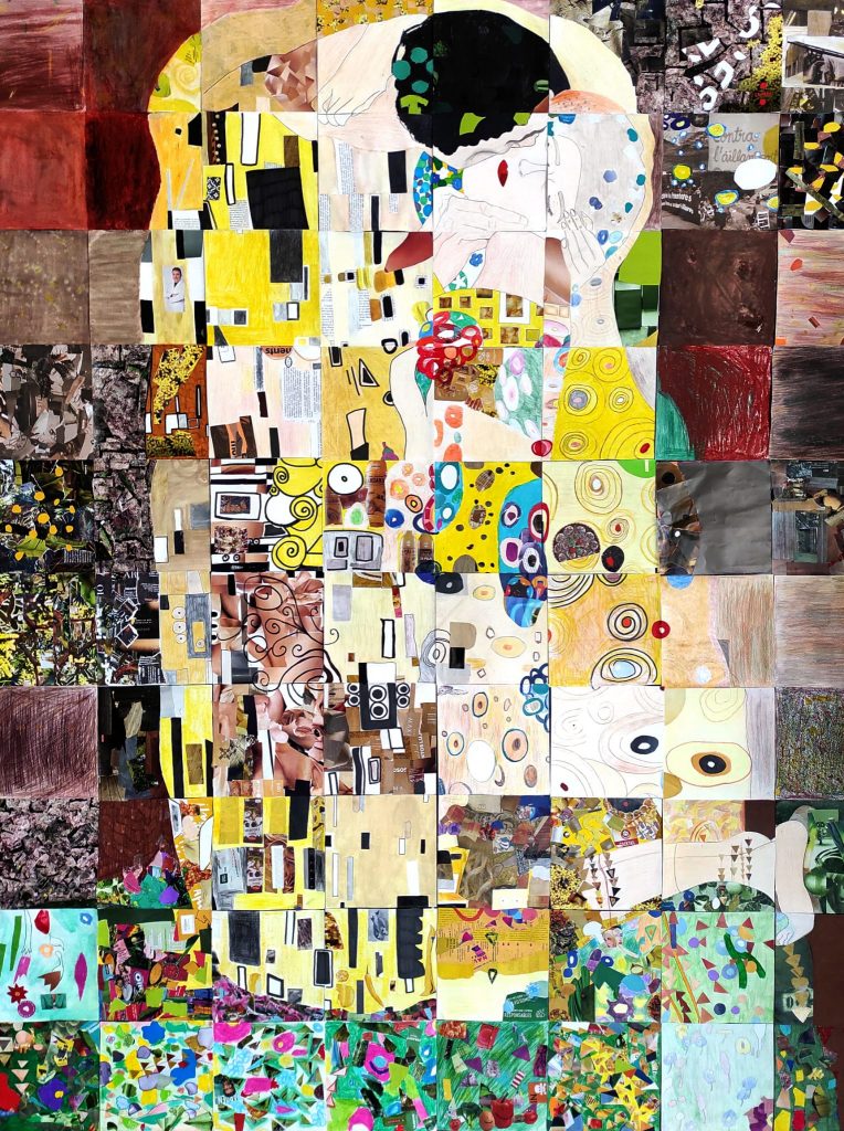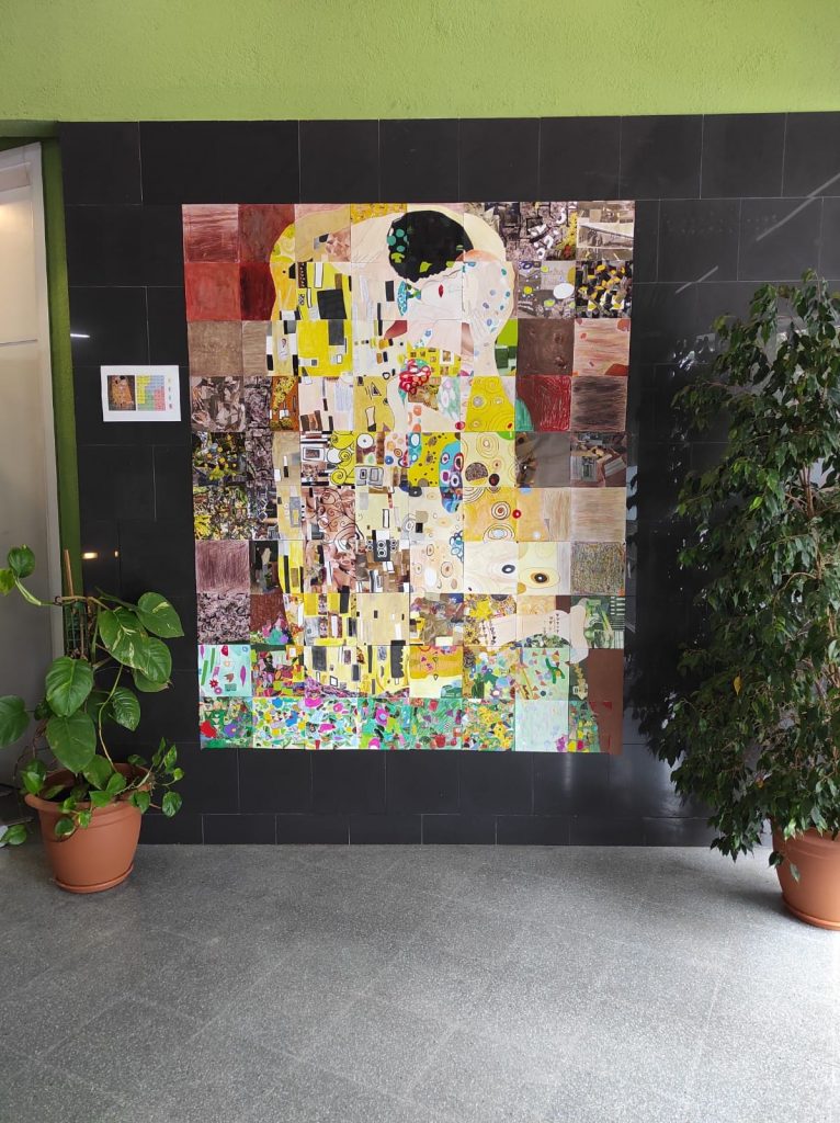 Els alumnes de 3r curs d’ESO han realitzat un mural del quadre El petó, de Gustav Klimt, amb la tècnica del collage. Han creat entre tots una obra fantàstica que podeu gaudir al vestíbul del centre, a la Rambla.