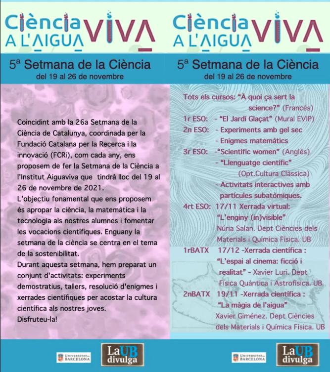 Publicat a 15 de novembre de 20215a. Setmana de la Ciència Ja tenim aquí de nou la Setmana de la Ciència.