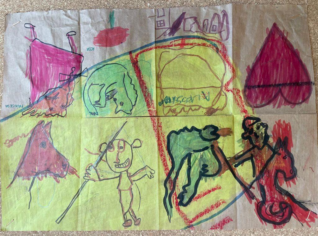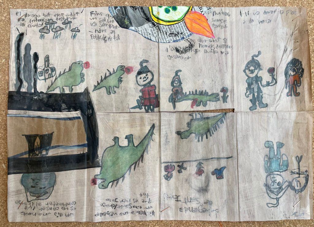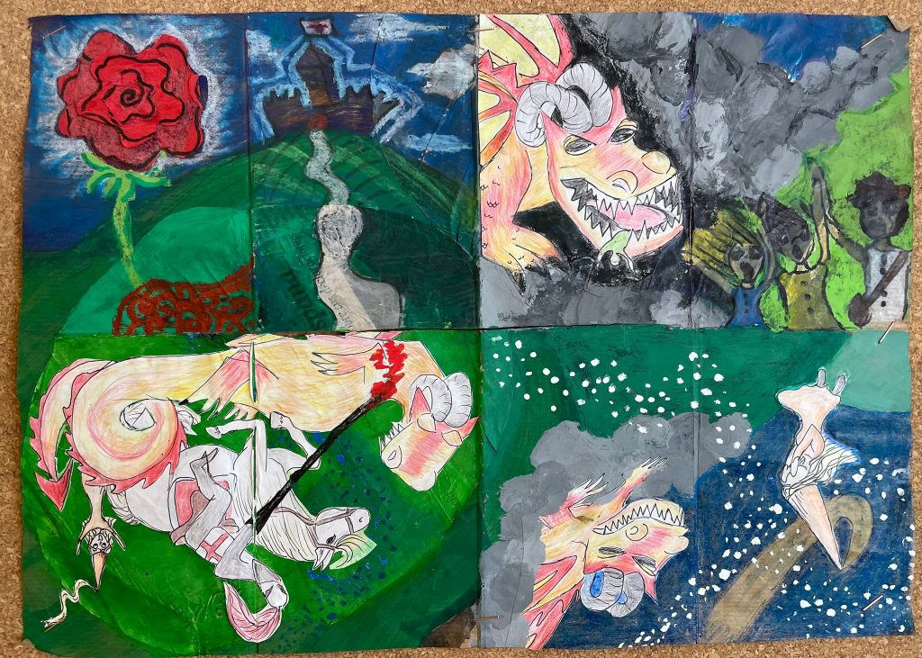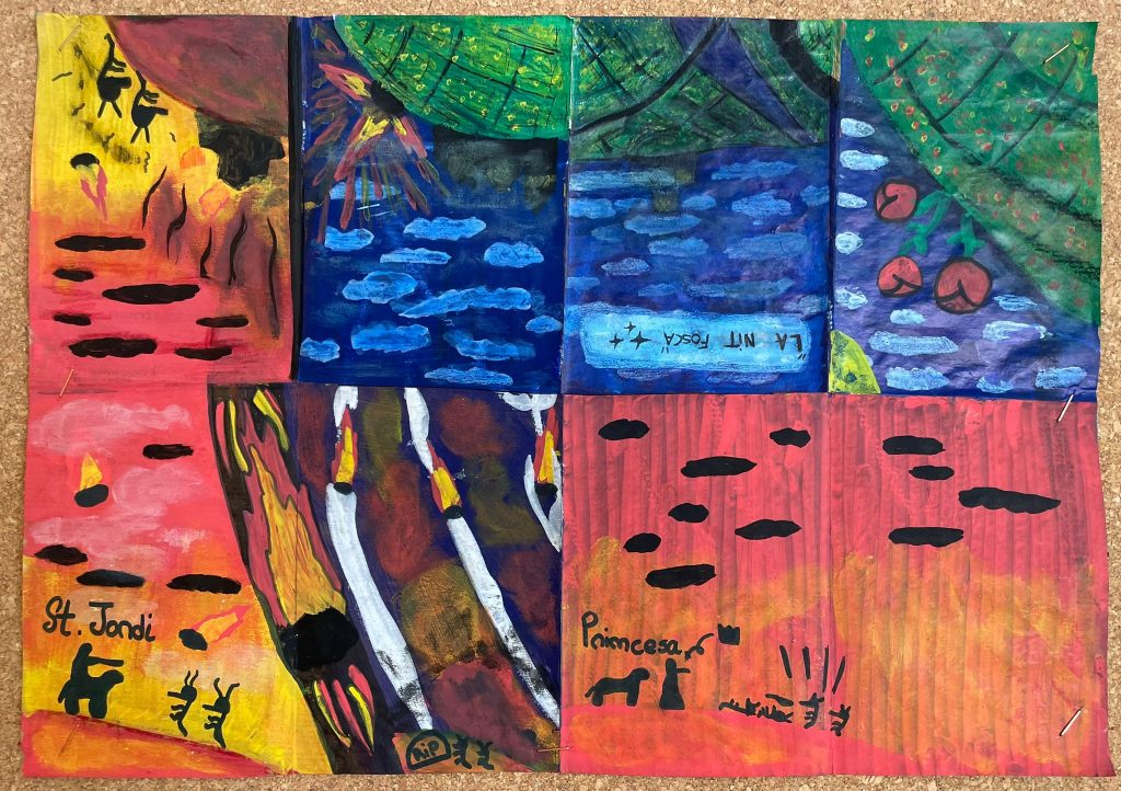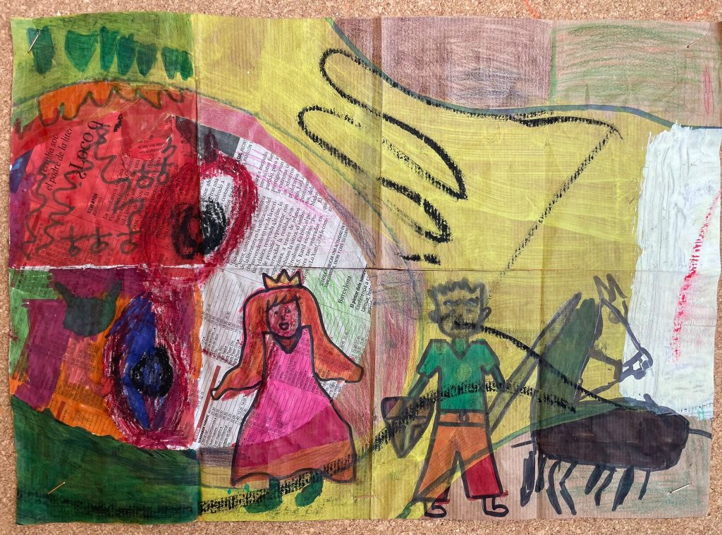 L’alumnat de 1r d’ESO treballa sobre paper reciclat i pintat, aprofitant les formes i textures que hi troben per dibuixar la seva pròpia versió de la història de Sant Jordi. El resultat, com és habitual, té una aparença força peculiar però fabulosa!
