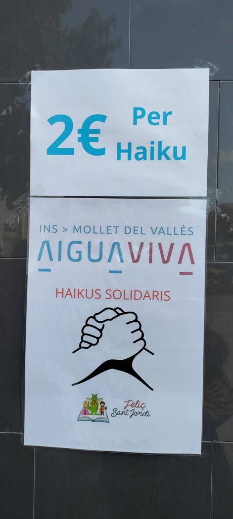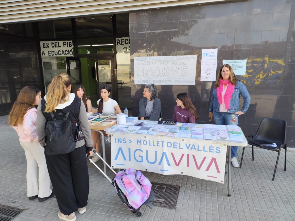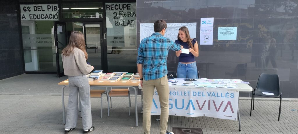 Començarem amb la paradeta d’Aiguaviva solidària que l’alumnat ha muntat a la porta de l’institut.