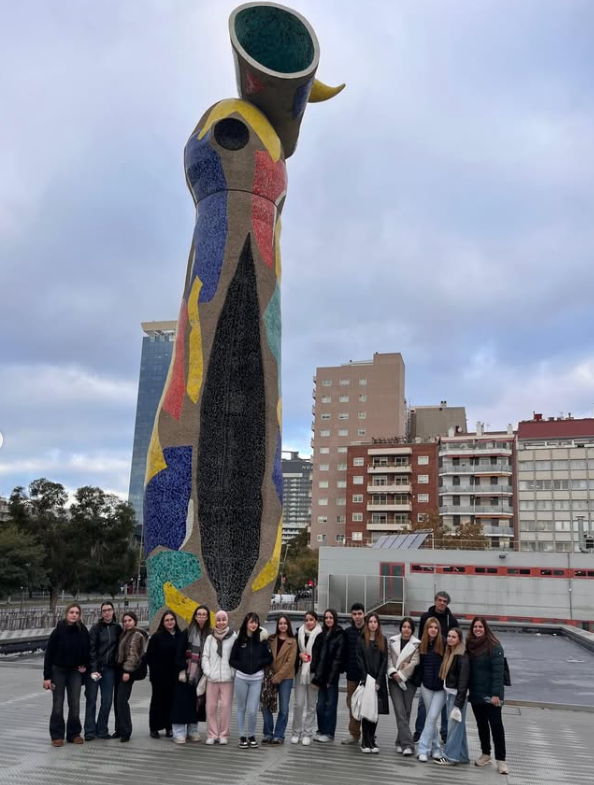 El passat 9 de desembre, l’alumnat de 2n de Batxillerat va transformar el temari d’Història de l’Art en una experiència viva i presencial. La sortida va començar davant de l’emblemàtica escultura Dona i Ocell, on els estudiants van poder descobrir el significat ocult d’aquesta obra monumental. Tot i que l’estany era buit i no permetia observar-hi el característic trencadís reflectit, el contacte directe amb l’univers de Miró va donar un toc de surrealisme a primera hora del matí.