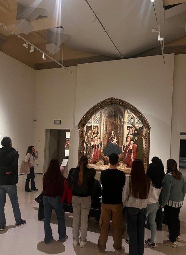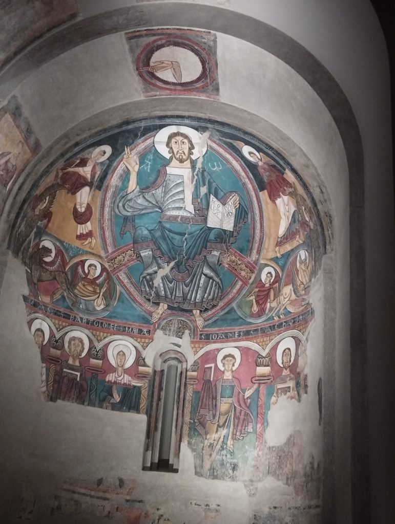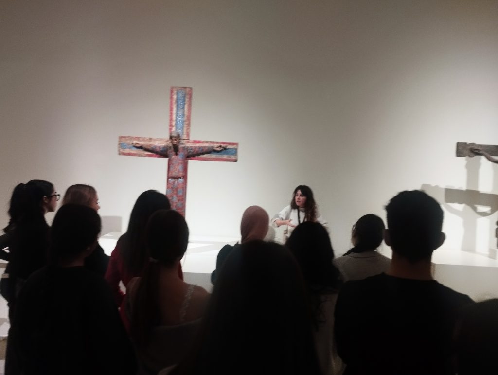 La ruta va continuar passant per les Quatre Columnes de Puig i Cadafalch, fins arribar al MNAC. Allà, una visita guiada va permetre endinsar-se a fons en els trets essencials del Romànic i el Gòtic. L’inici no podia ser més imponent: el Pantocràtor de Sant Climent de Taüll, màxim exponent del romànic català, que va captivar els estudiants amb la seva mirada omnipresent. Davant de les obres, conceptes tècnics com l’strappo, la sinopia o el fresc van adquirir un significat real i tangible.