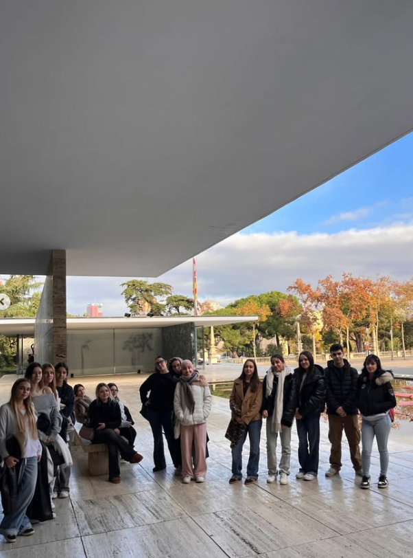 La segona parada els va portar fins al Pavelló Alemany de Mies van der Rohe, rèplica fidel de l’original presentat a l’Exposició Internacional de 1929. Aquest espai, símbol del funcionalisme, va sorprendre un cop més per la seva puresa arquitectònica. Amb els estanys plens, els estudiants van poder contemplar-hi el reflex de L’Alba, l’escultura de Kolbe que sembla convidar a imitar-ne la postura —sobretot si això suposa un increment de nota. “Menys és més”, el lema de Mies, va ressonar entre els alumnes mentre comprovaven la bellesa que pot tenir una arquitectura pràcticament despullada de decoració. La professora no va deixar escapar l’ocasió per recomanar Contratiempo, film on l’escultura i el pavelló tenen un protagonisme inesperat.